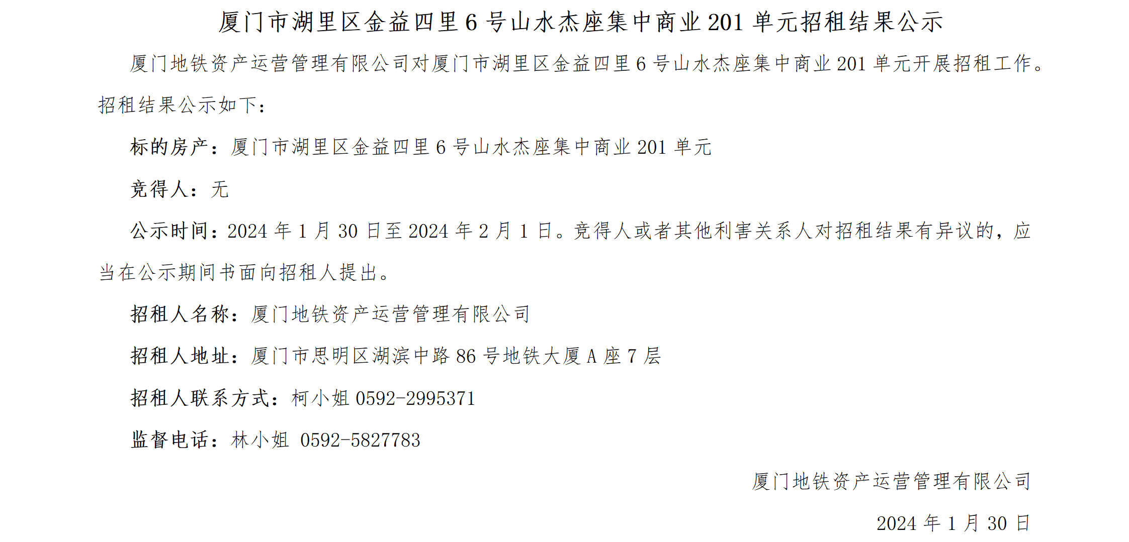 厦门市湖里区金益四里6号山水杰座集中商业201单元招租结果公示
