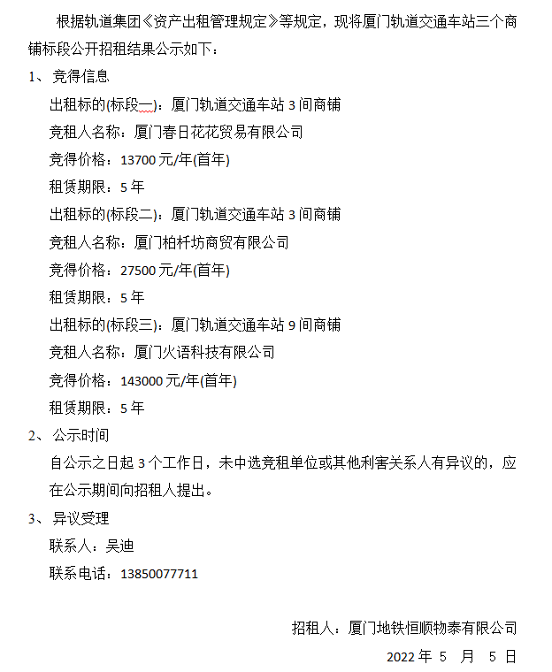 厦门轨道交通车站三个商铺标段公开招租结果公示