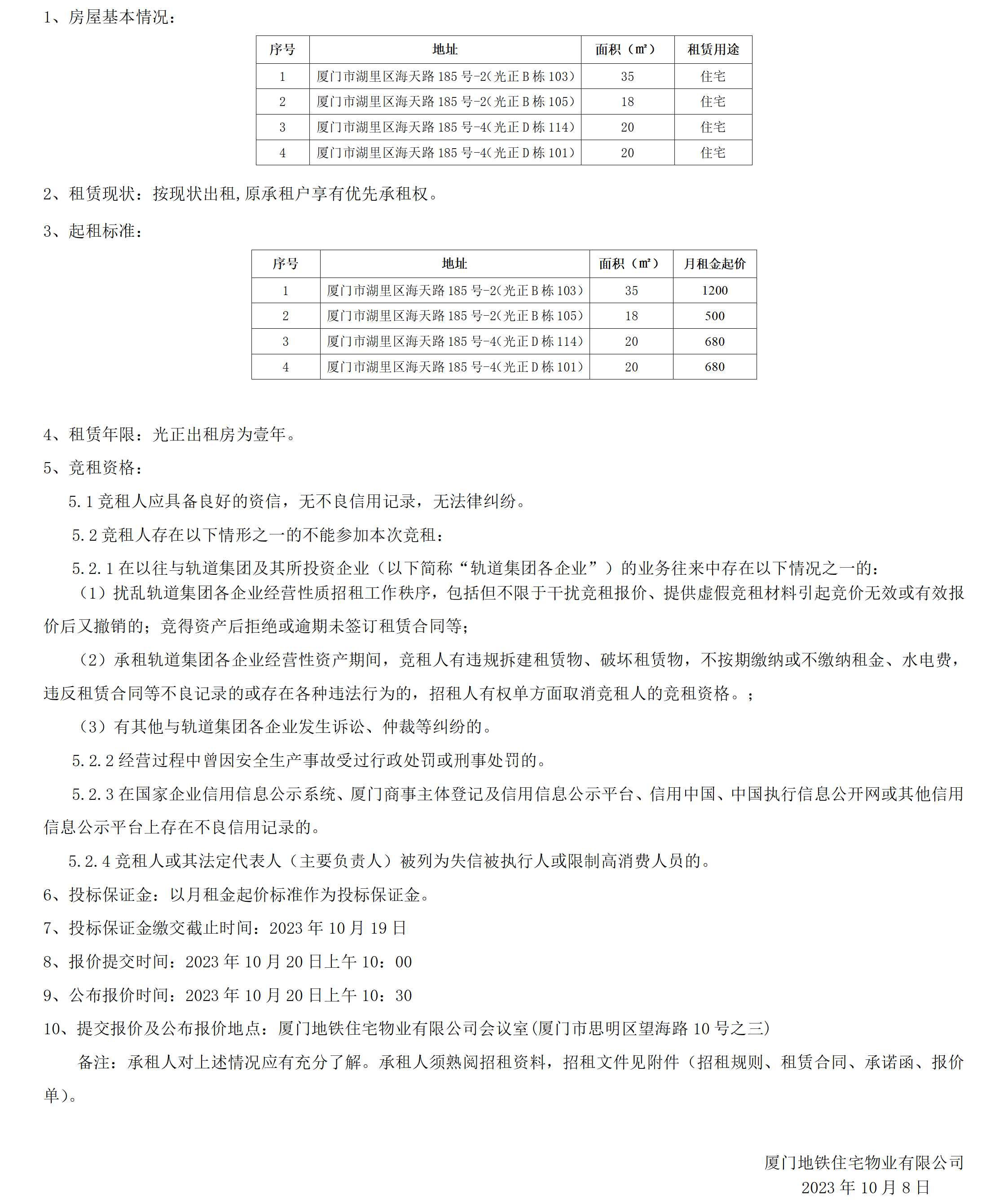 厦门地铁住宅物业有限公司关于湖里区海天路185号-2(光正B栋103)等4套房产公开招租信息