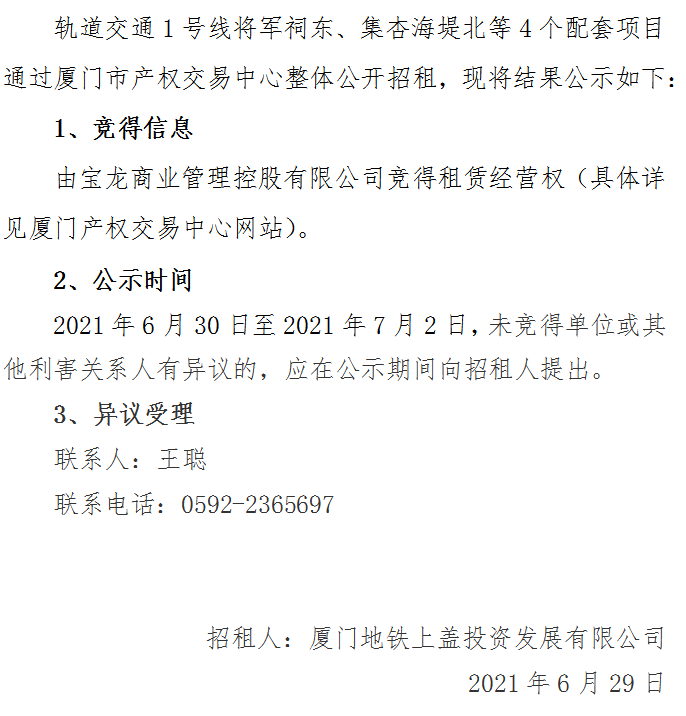 轨道交通1号线将军祠东、集杏海堤北等4个配套项目整体招租结果公示
