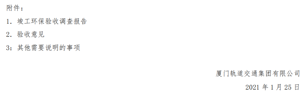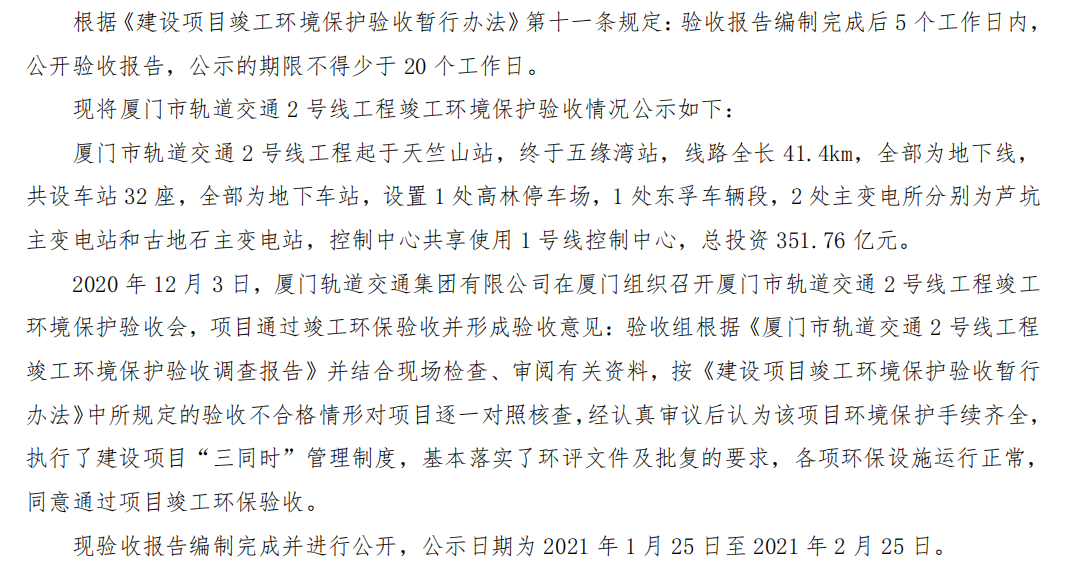 关于厦门市轨道交通2号线工程竣工环保验收报告的公示