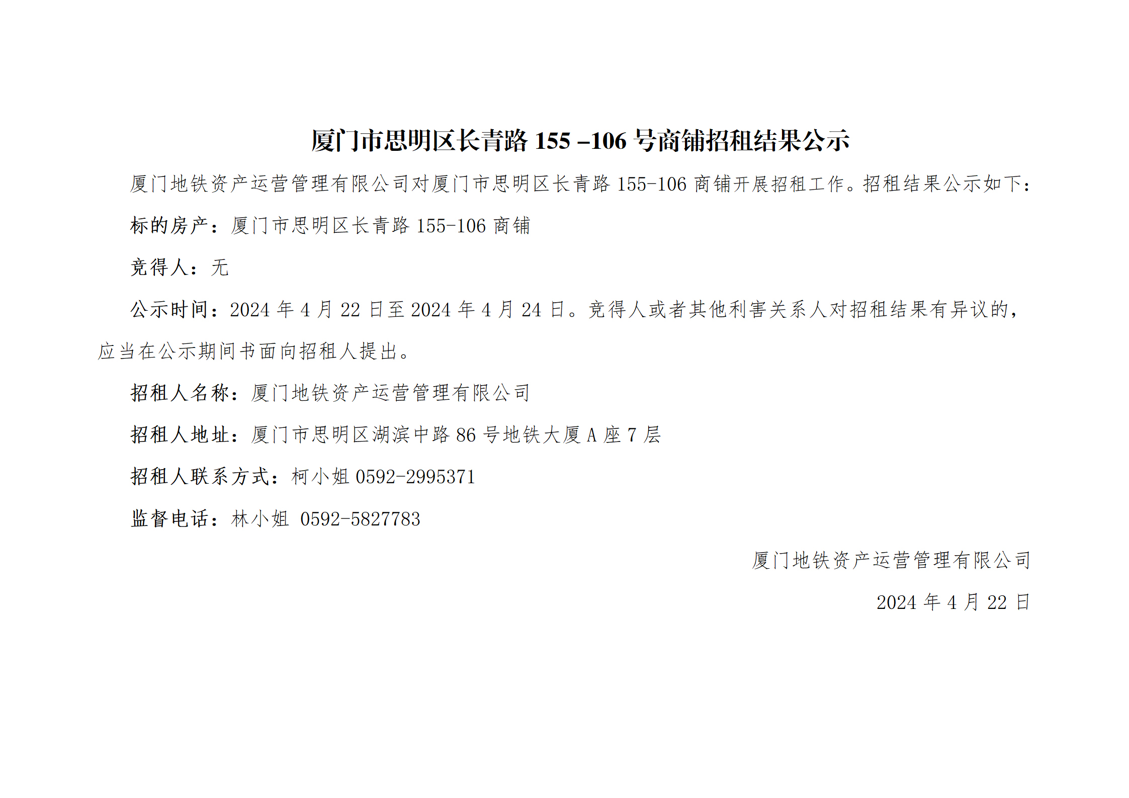 厦门地铁资产运营管理有限公司对厦门市思明区长青路155-106商铺招租结果公示