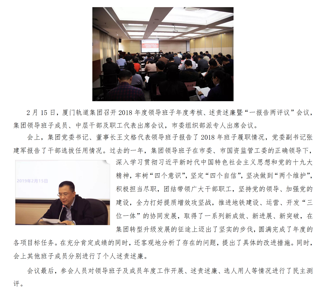 厦门轨道集团召开2018年度领导班子年度考核、述责述廉暨“一报告两评议”会议