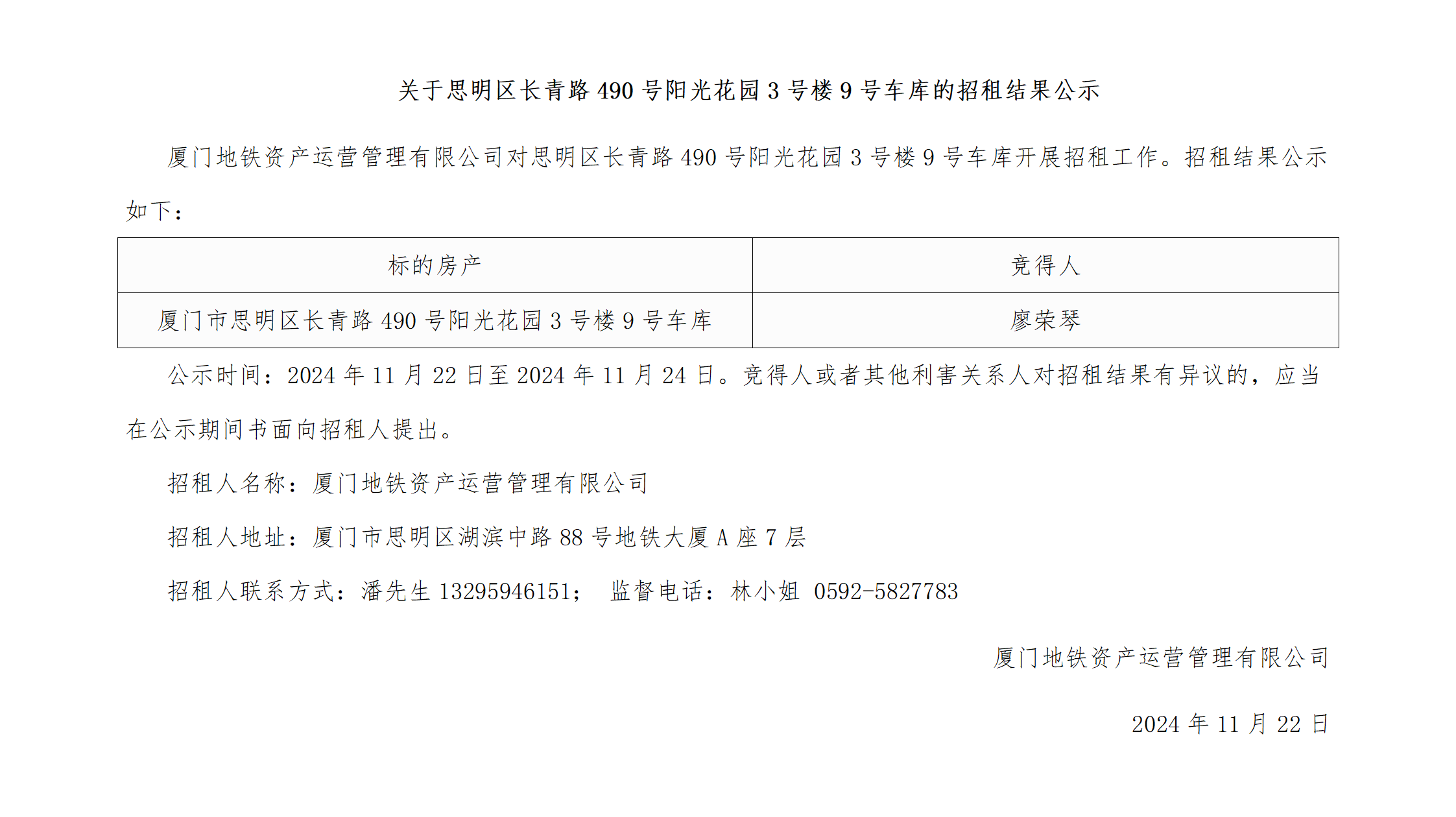 关于思明区长青路490号阳光花园3号楼9号车库的招租结果公示