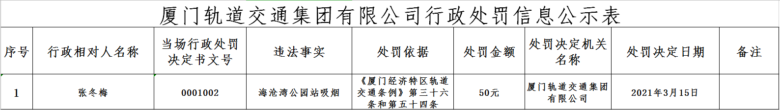 厦门轨道交通集团有限公司行政处罚信息公示(2021.3.15-2021.3.22)