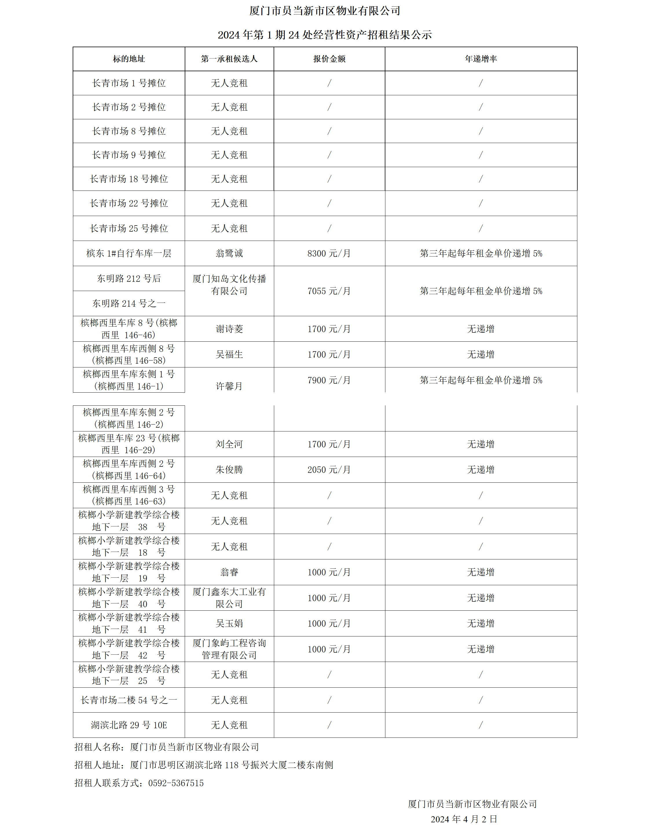 厦门市员当新市区物业有限公司2024年第1期24处经营性资产招租结果公示