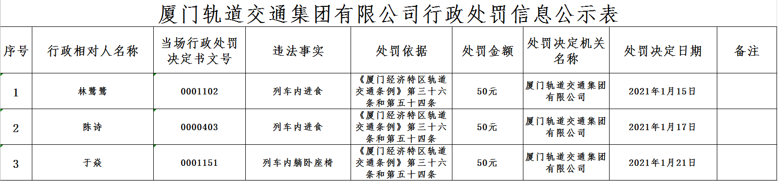 厦门轨道交通集团有限公司行政处罚信息公示(2021.1.22-2021.1.29)