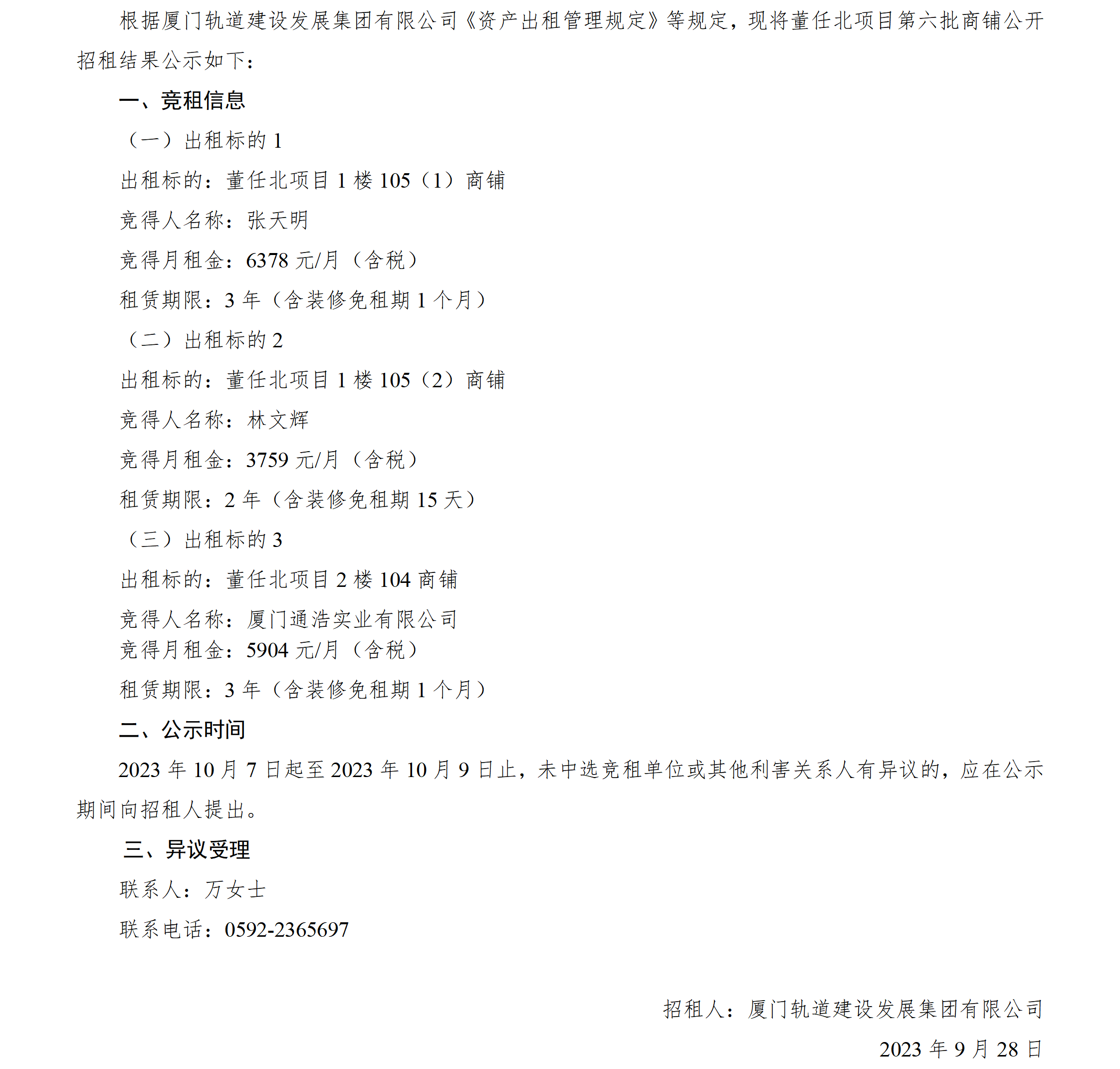 董任北项目第六批商铺公开招租结果公示