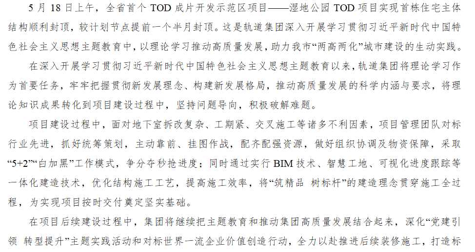 主题教育 | 湿地公园TOD项目首栋住宅今日提前封顶