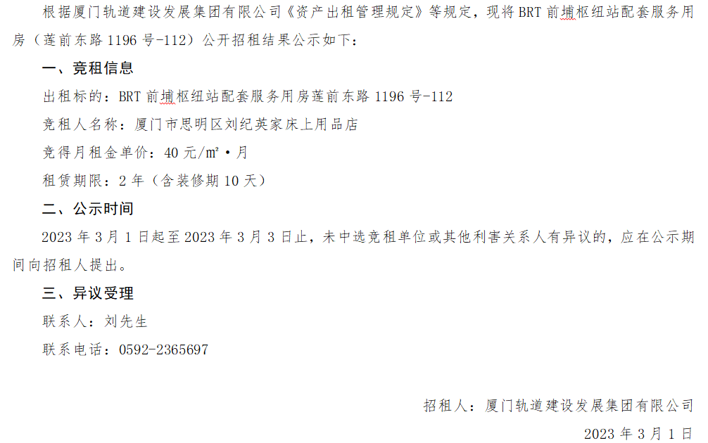 厦门轨道交通BRT前埔枢纽站配套服务用房(莲前东路1196号-112)公开招租结果公示