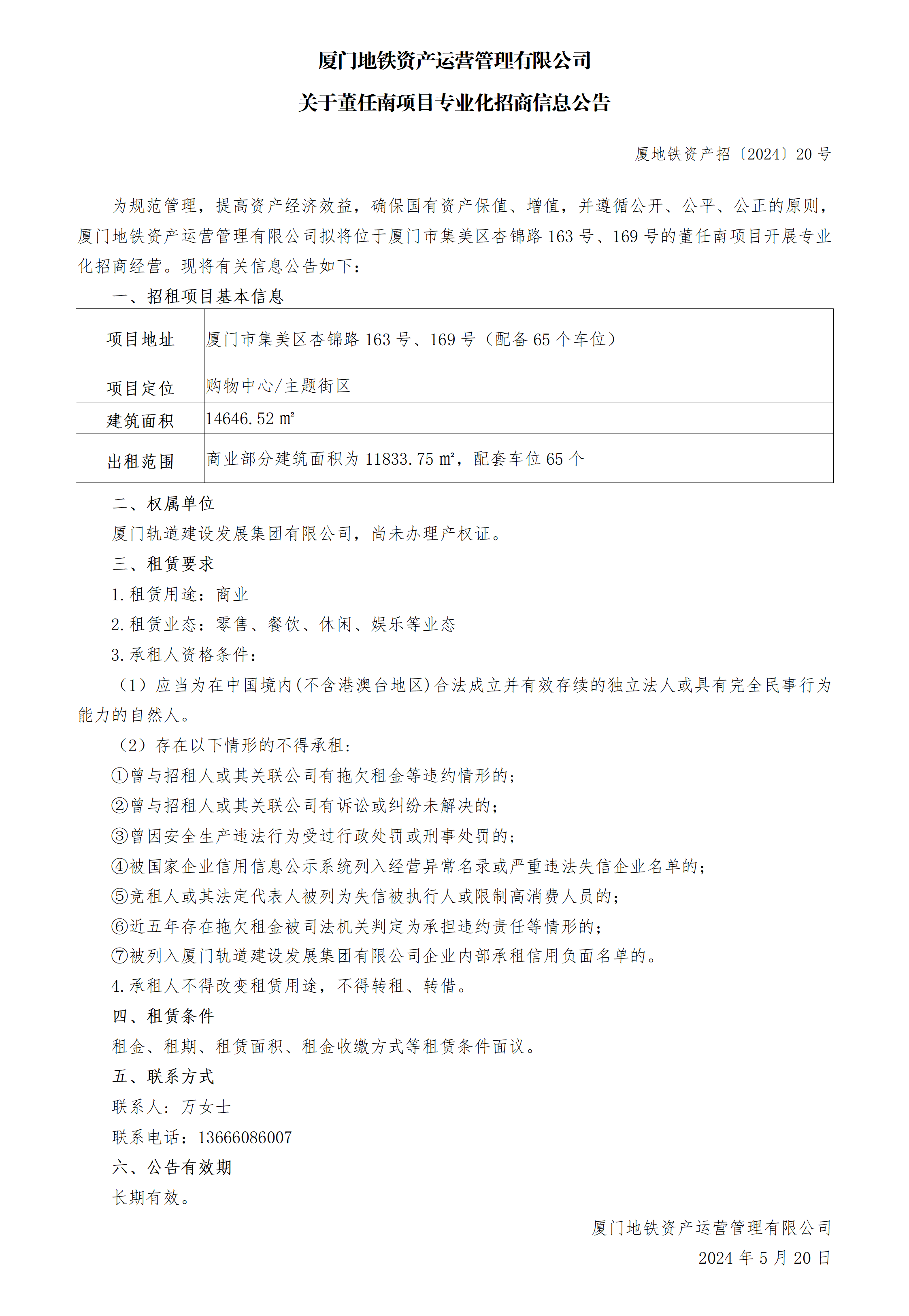 厦门地铁资产运营管理有限公司关于董任南项目专业化招商信息公告