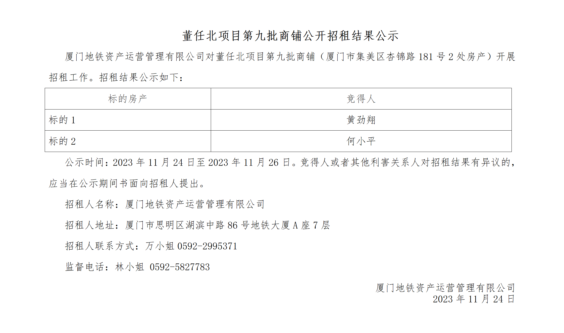 董任北项目第九批商铺公开招租结果公示