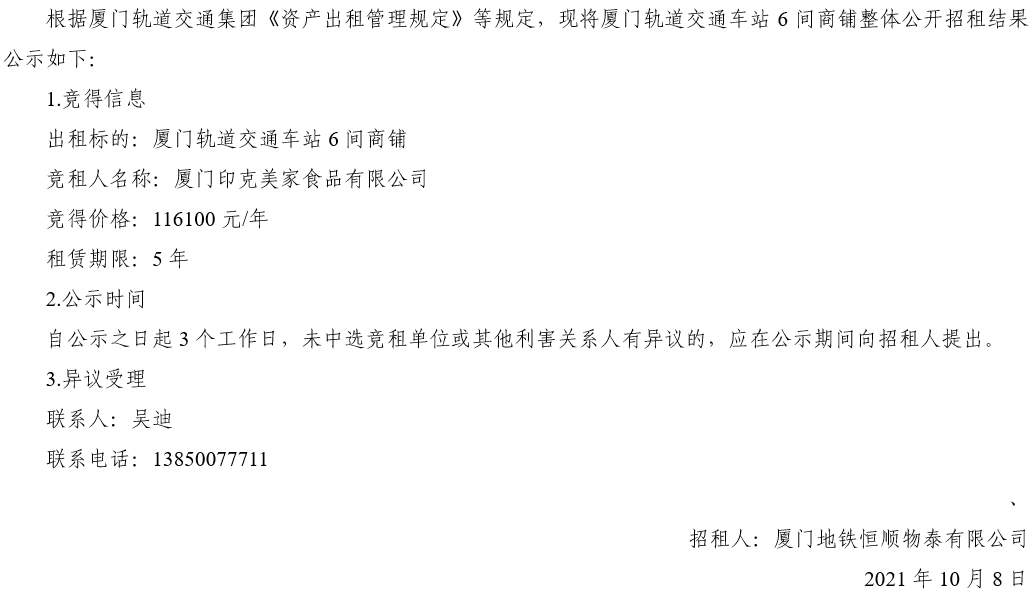 厦门轨道交通车站6间商铺整体公开招租结果公示