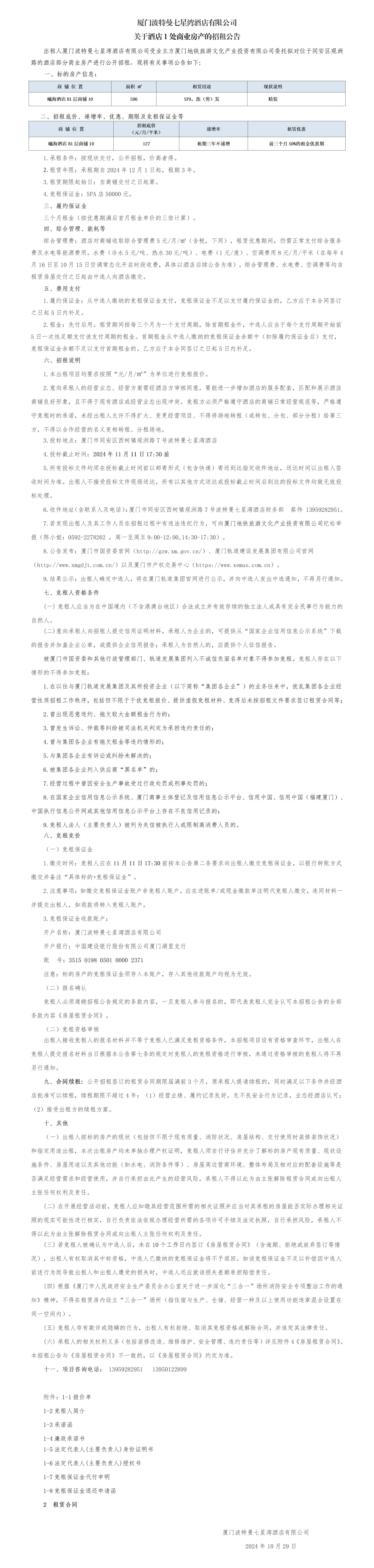 厦门波特曼七星湾酒店有限公司关于酒店1处商业房产的招租公告