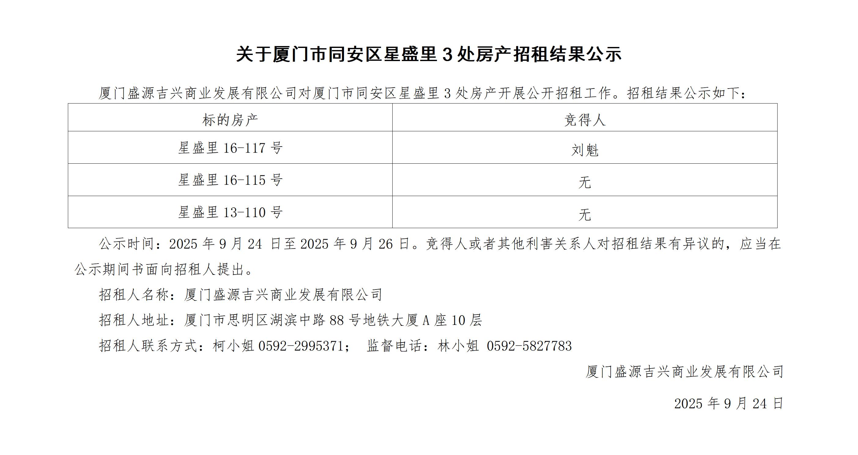关于厦门市同安区星盛里3处房产招租结果公示