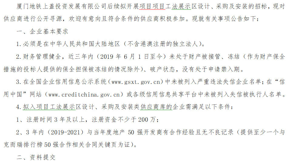 关于项目工法展示区设计、采购及安装供应商的寻源公告