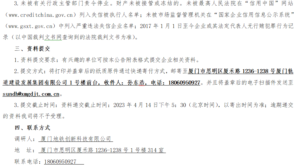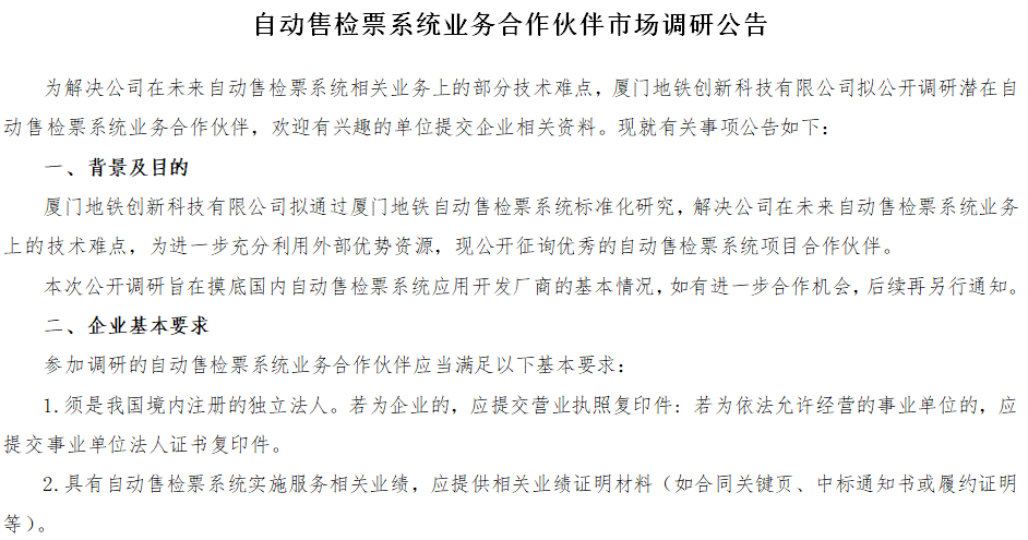 厦门地铁自动售检票系统业务合作伙伴市场调研公告