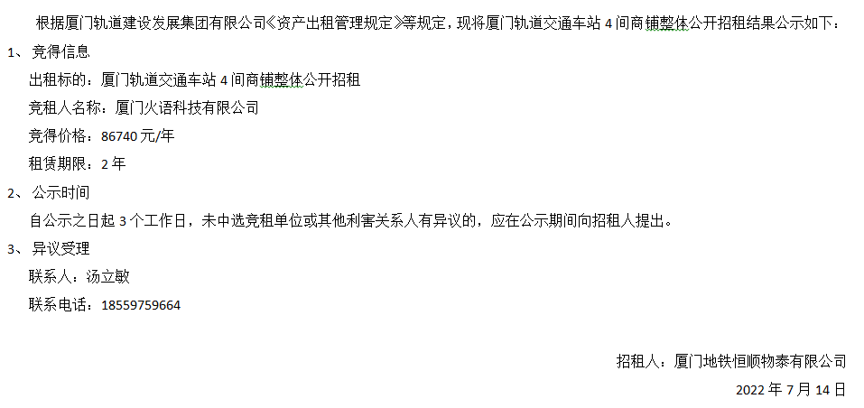 厦门轨道交通车站4间商铺整体公开招租结果公示