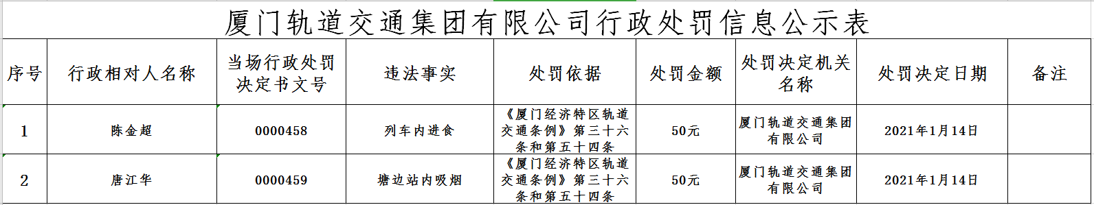 厦门轨道交通集团有限公司行政处罚信息公示(2021.1.15-2021.1.21)