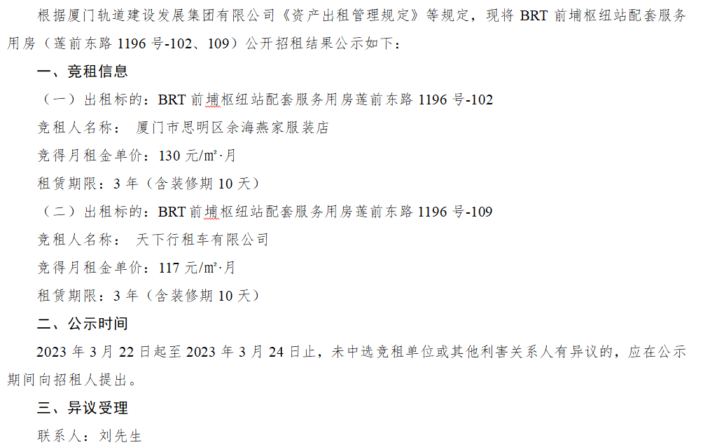 厦门轨道交通BRT前埔枢纽站配套服务用房(莲前东路1196号-102、109)公开招租结果公示