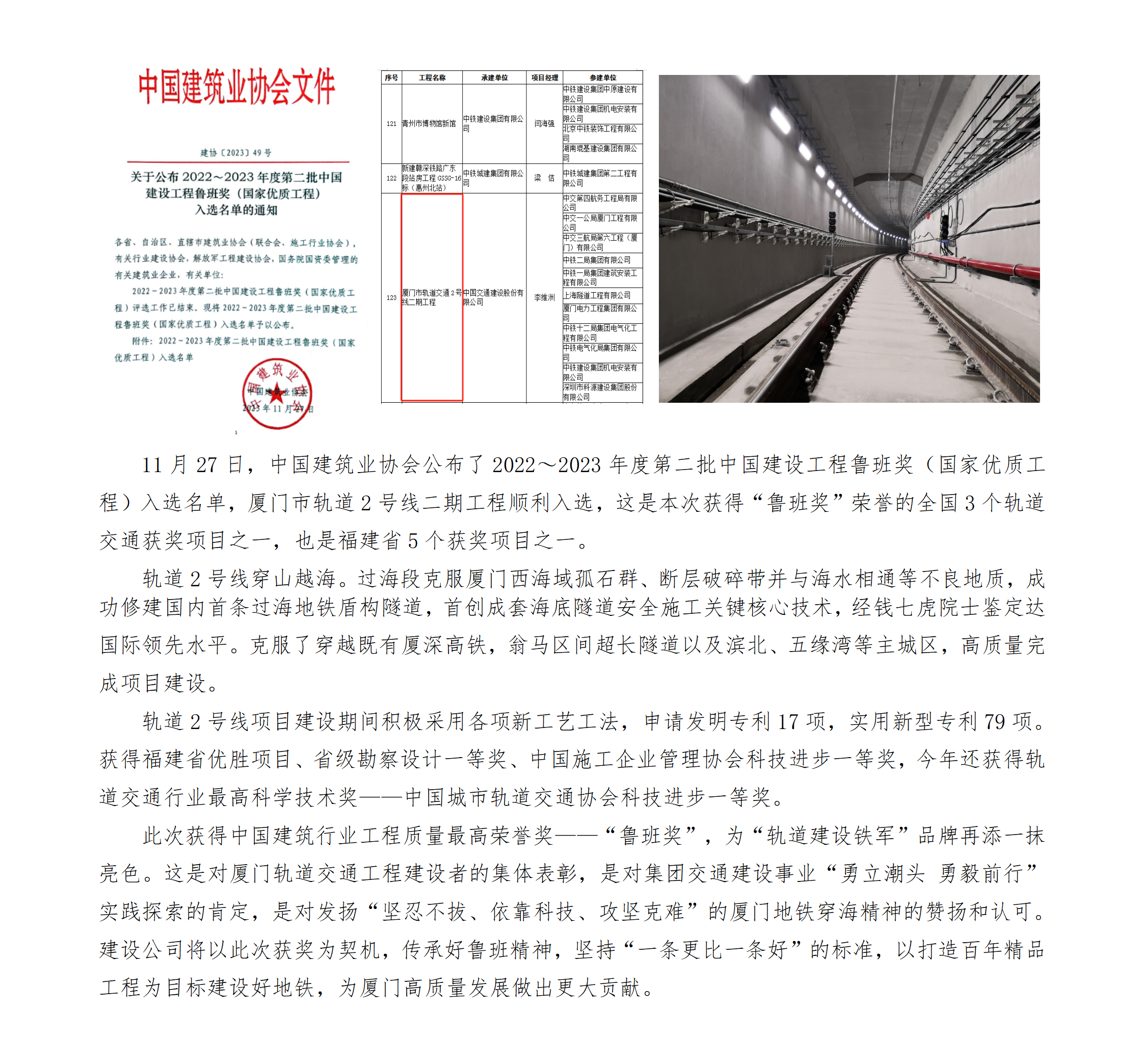 厦门市轨道交通2号线二期工程入选 2022~2023年度中国建设工程鲁班奖