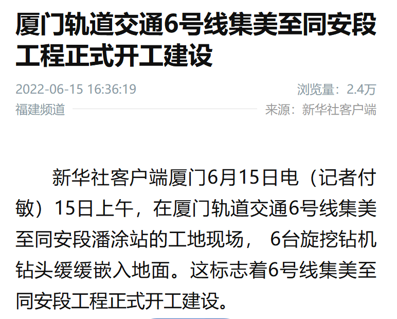 【新华社】:厦门轨道交通6号线集美至同安段工程正式开工建设