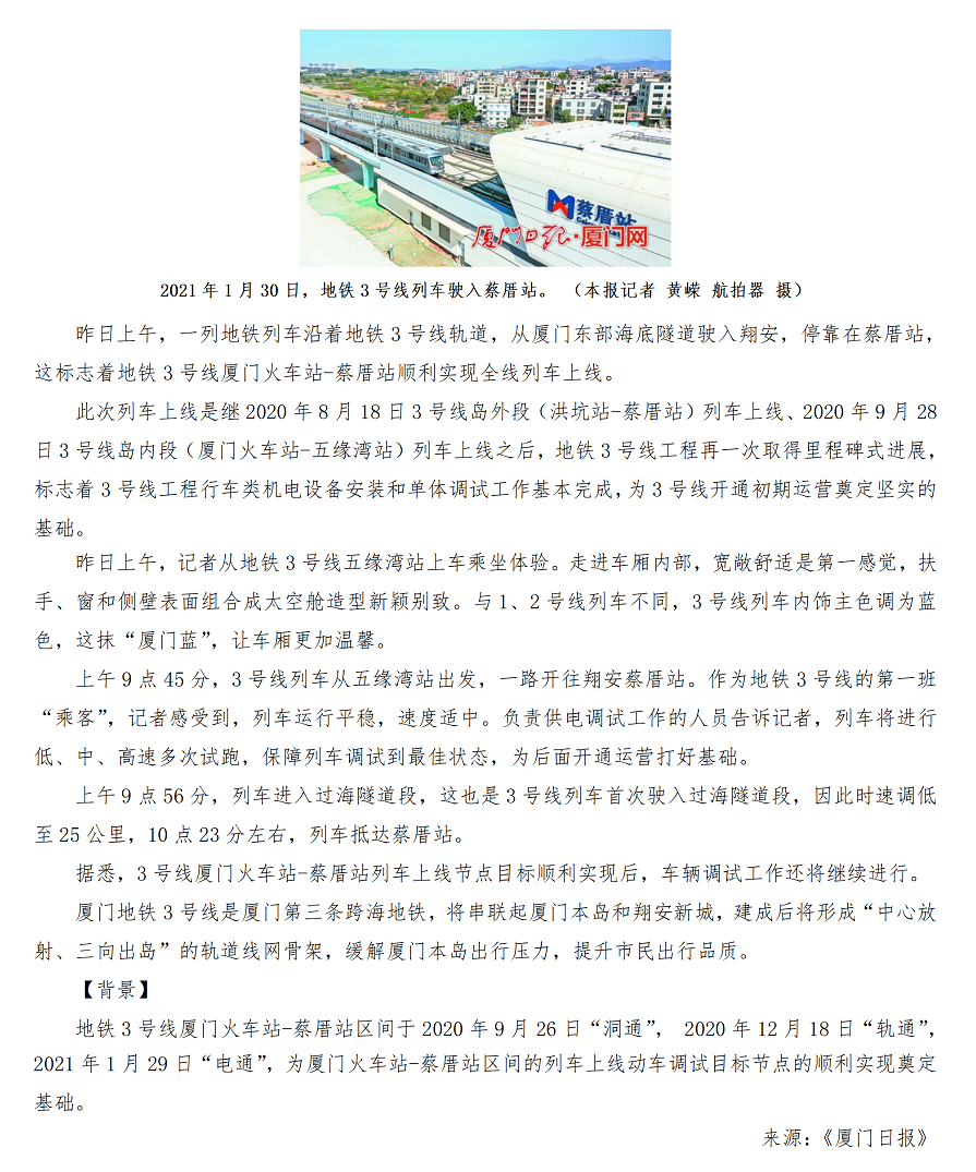 【厦门日报】:地铁3号线首次驶入过海隧道