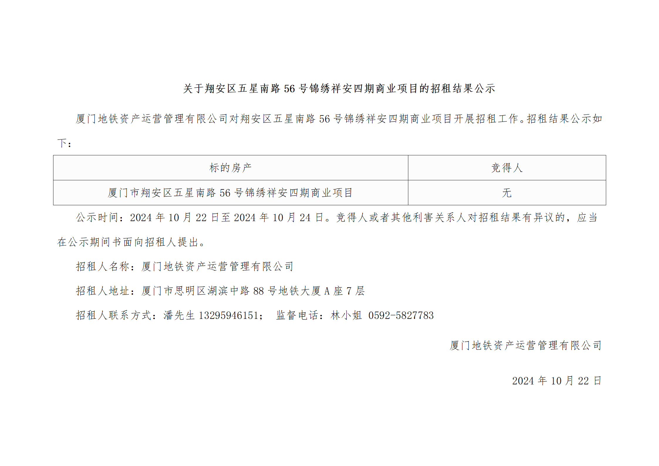 关于翔安区五星南路56号锦绣祥安四期商业项目的招租结果公示