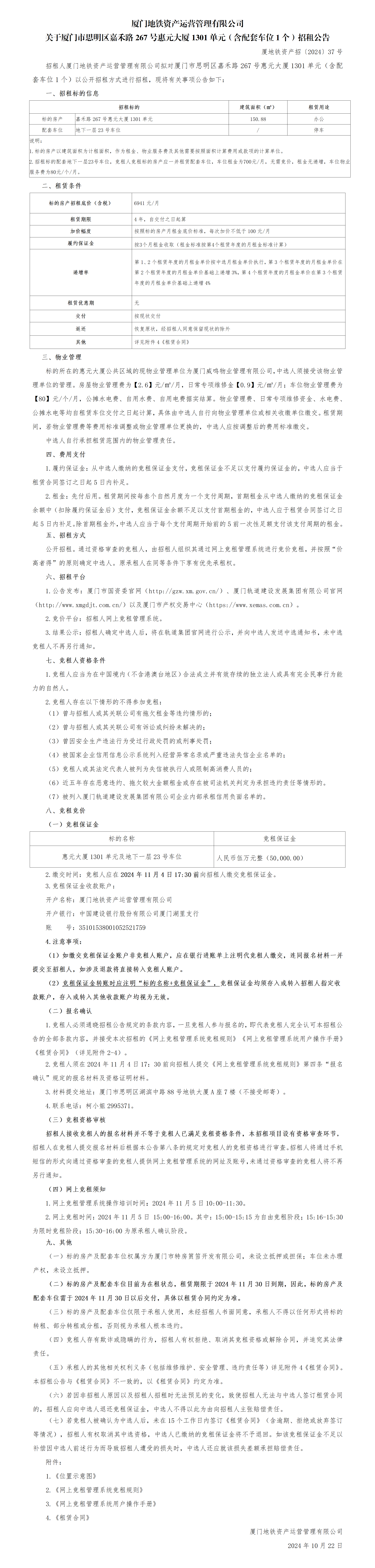 关于厦门市思明区嘉禾路267号惠元大厦1301单元(含配套车位1个)招租公告