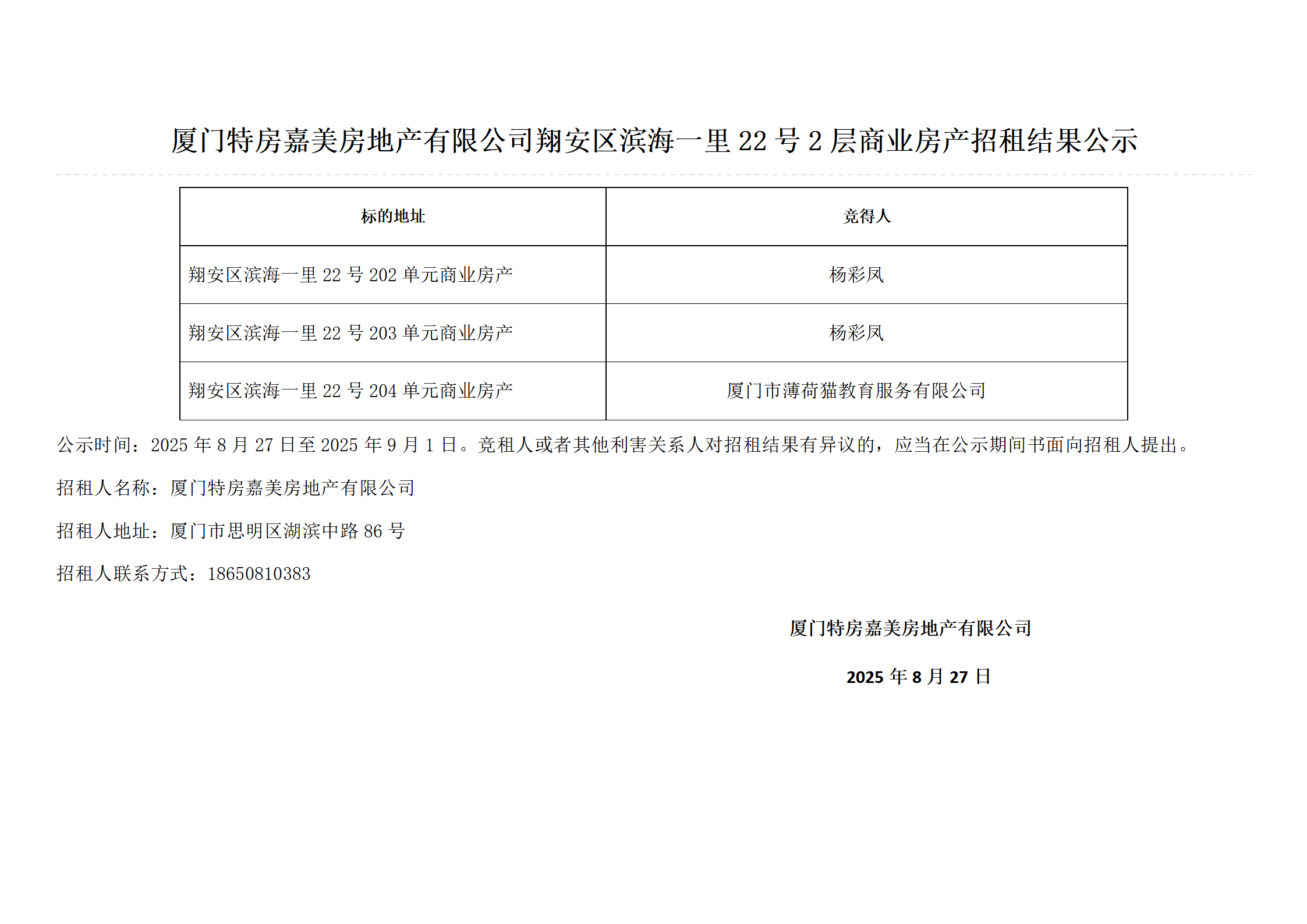 厦门特房嘉美房地产有限公司翔安区滨海一里22号2层商业房产招租结果公示