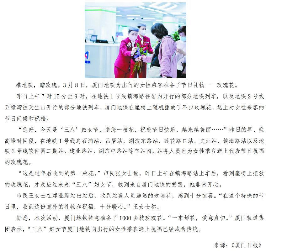 【厦门日报】:喜悦!乘地铁获赠玫瑰花