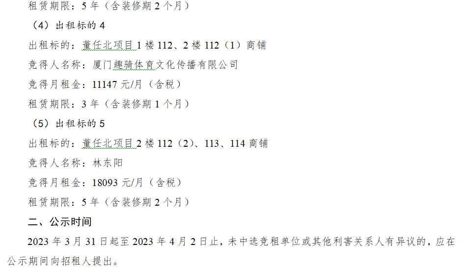 厦门轨道交通董任北项目第二批商铺公开招租结果公示