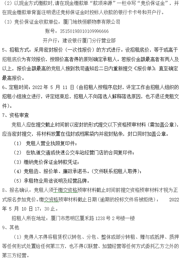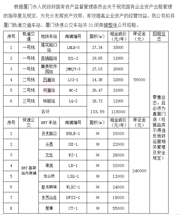 厦门轨道交通车站、厦门快速公交车站共21间商铺整体公开招租公告