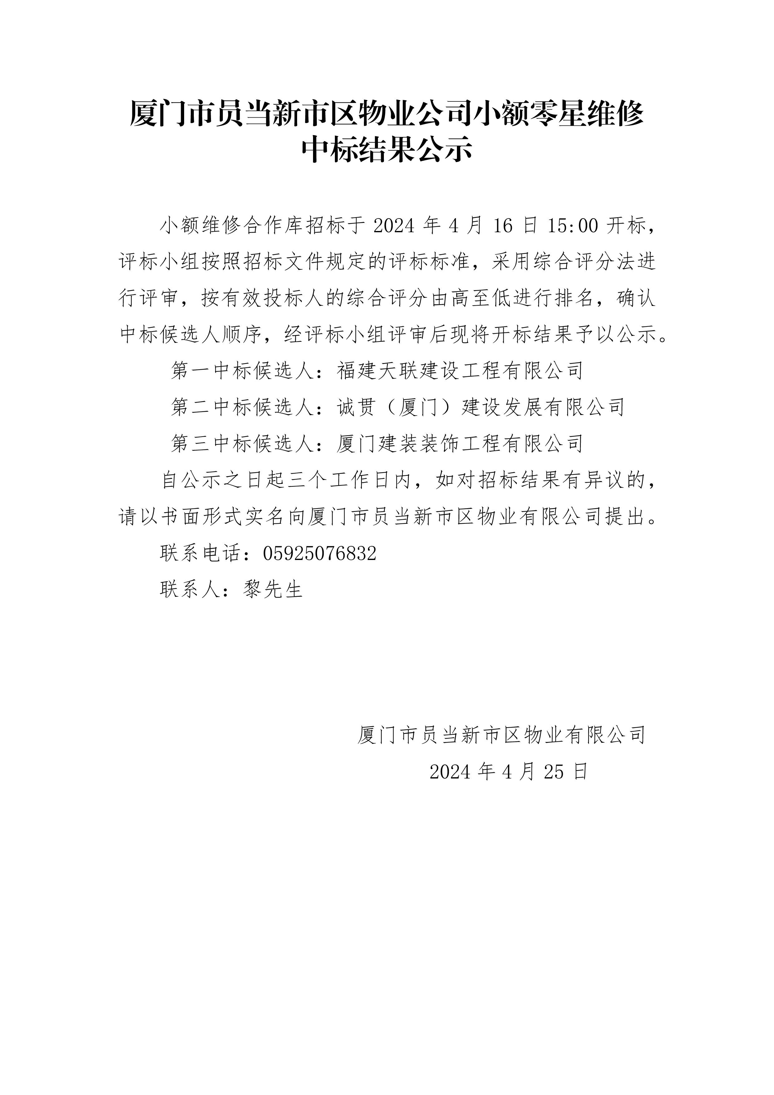 厦门市员当新市区物业公司小额零星维修中标结果公示