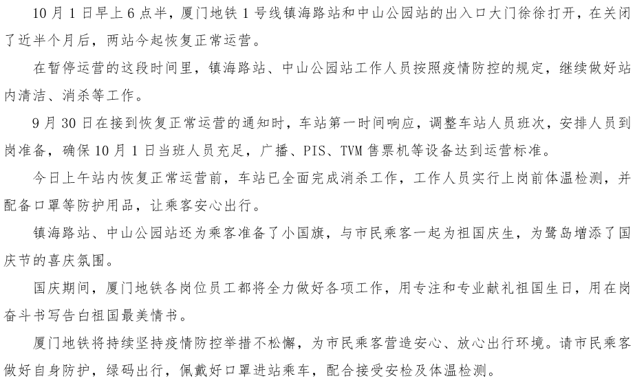 开站!厦门地铁1号线镇海路站、中山公园站恢复正常运营