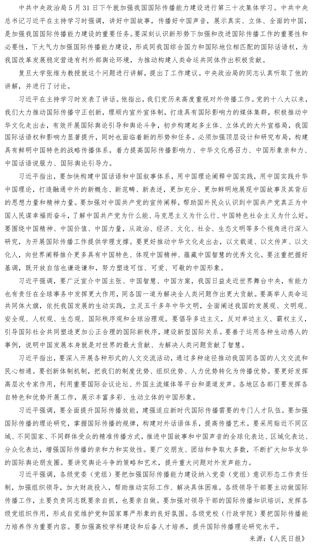 习近平在中共中央政治局第三十次集体学习时强调 加强和改进国际传播工作 展示真实立体全面的中国