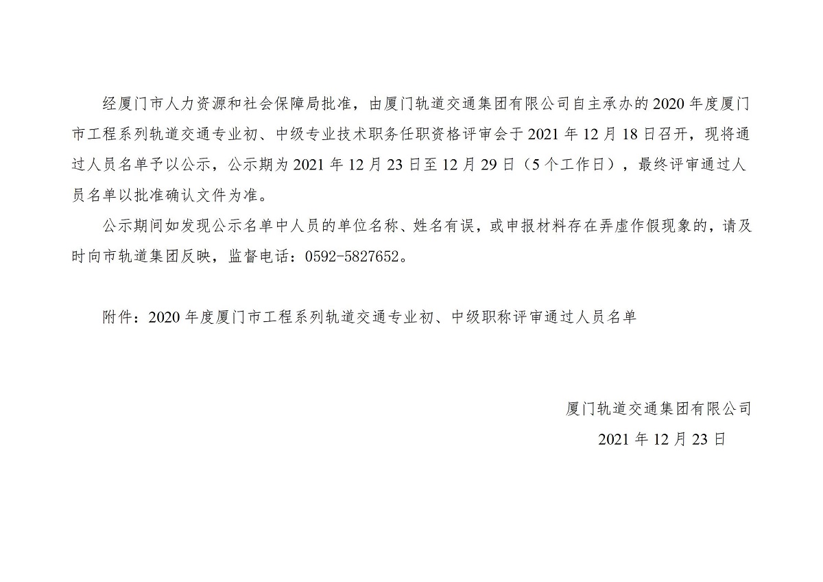 厦门轨道交通集团有限公司关于2020年度工程系列轨道交通专业初中级专业技术职务任职资格评审通过人员名单的公示