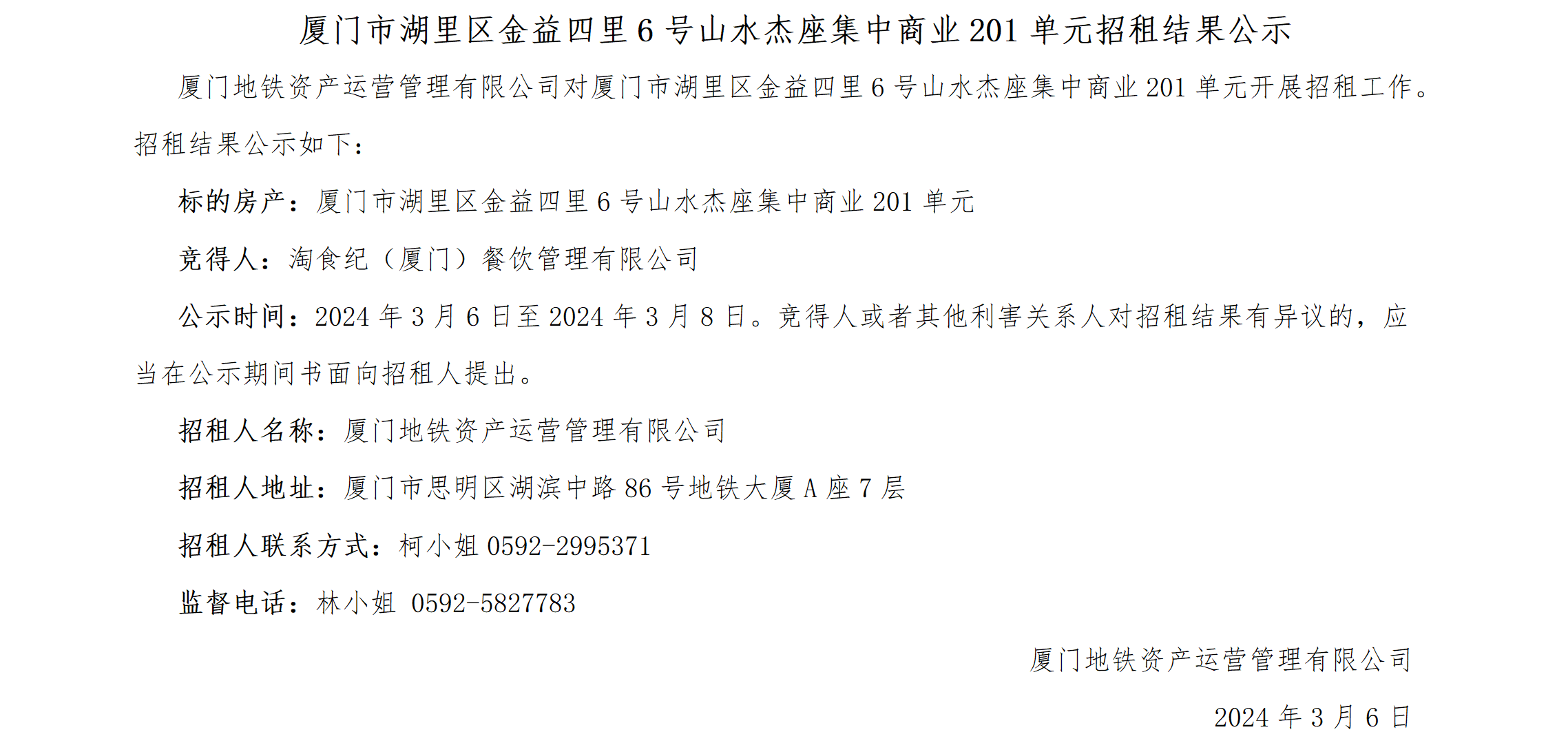 厦门市湖里区金益四里6号山水杰座集中商业201单元招租结果公示