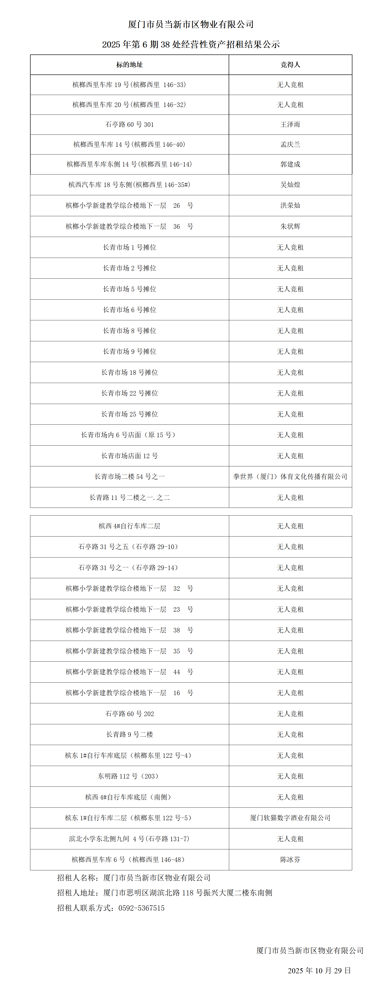 厦门市员当新市区物业有限公司2025年第6期38处经营性资产招租结果公示