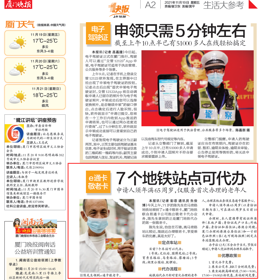 【厦门晚报】:7个地铁站点可代办e通卡敬老卡