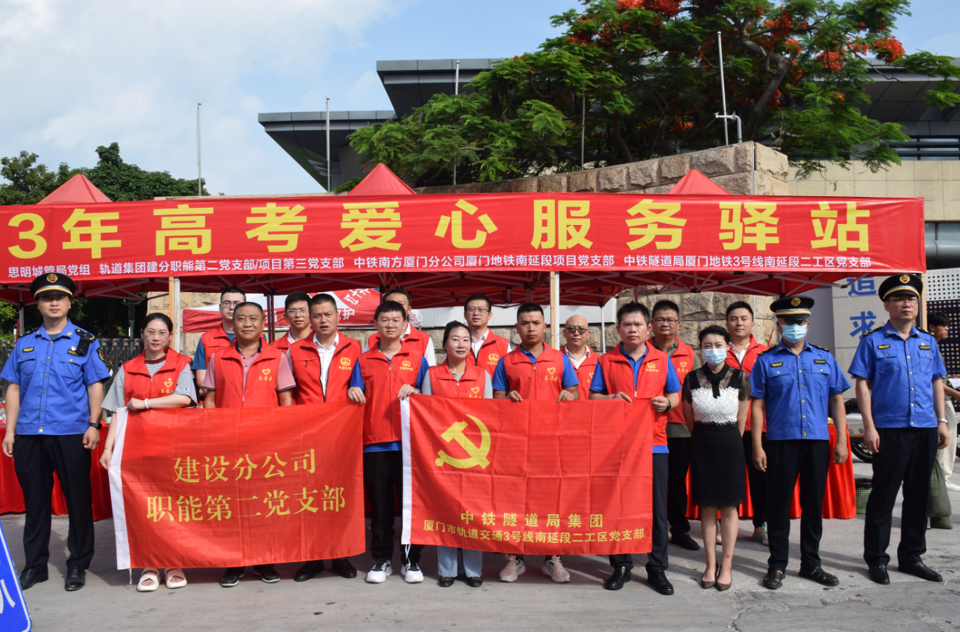 建设分公司职能第二党支部、项目第三党支部,联合市执法局、思明区城管局、中铁南方厦门分公司3号线南延段项目部于科技中学设置高考爱心服务驿站。