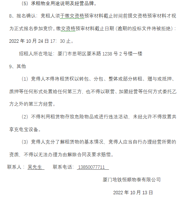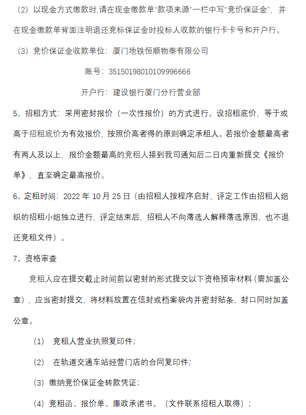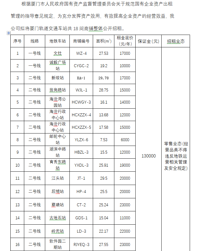 厦门轨道交通车站共18间商铺整体公开招租公告