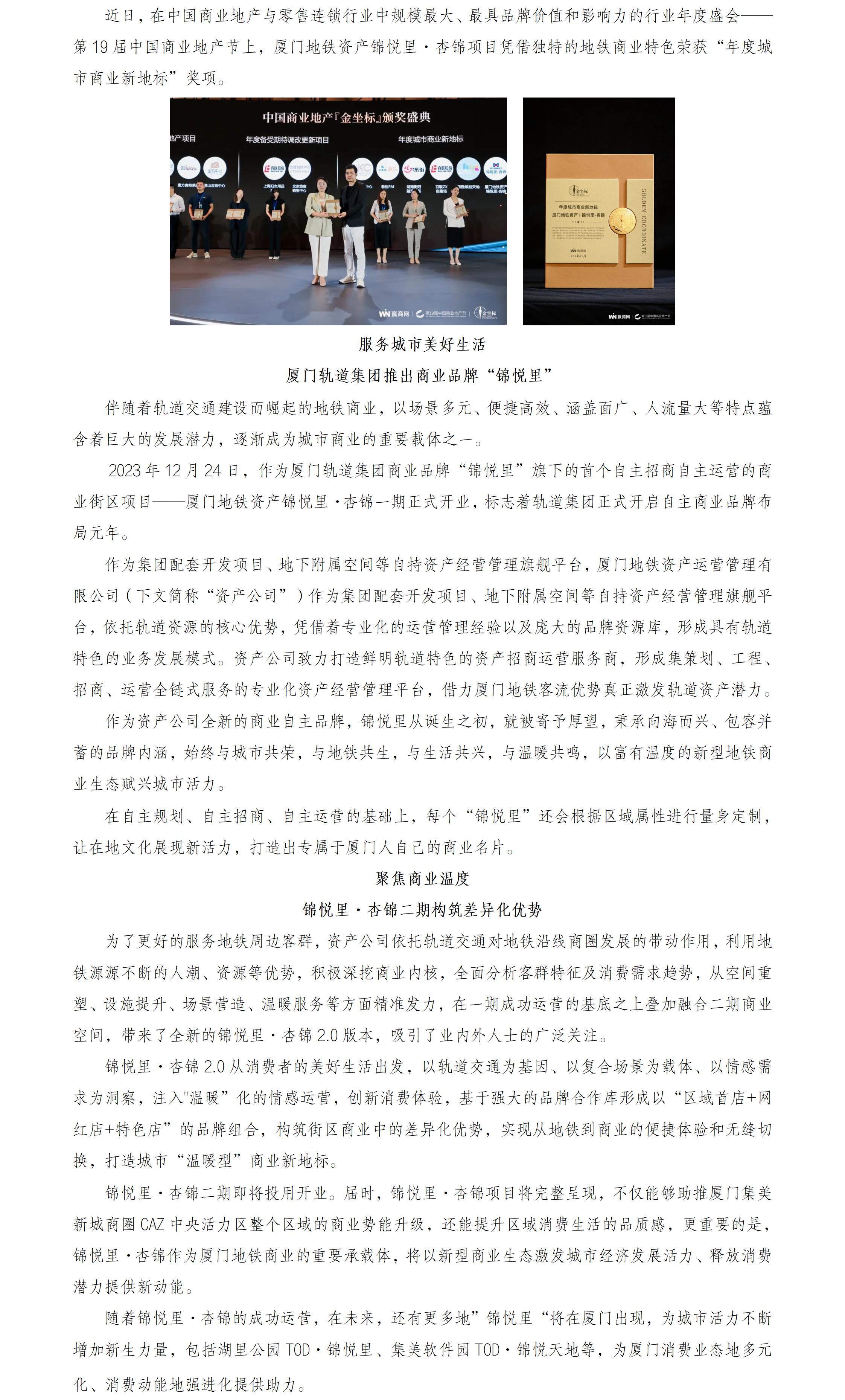 厦门地铁锦悦里·杏锦项目获“年度城市商业新地标”奖