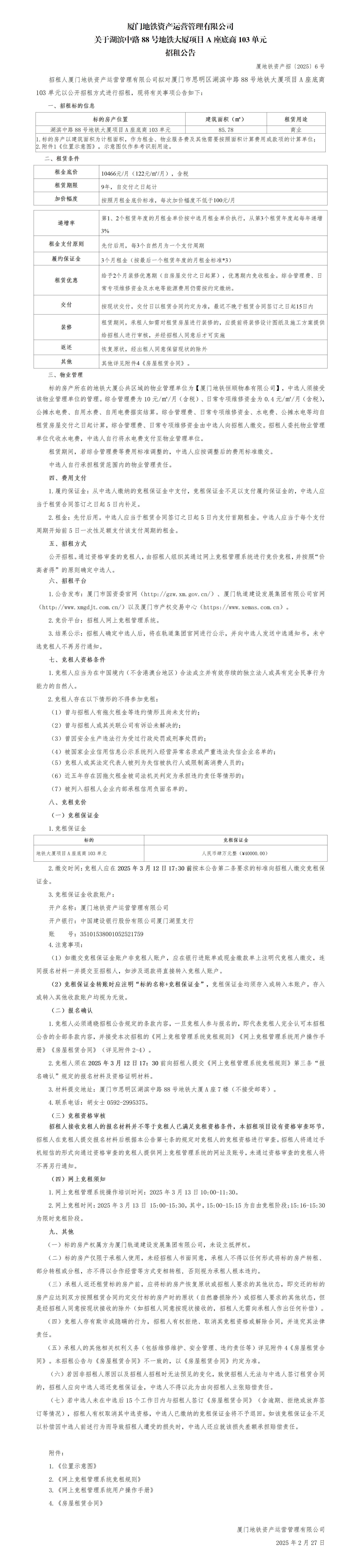 关于湖滨中路88号地铁大厦项目A座底商103单元 招租公告