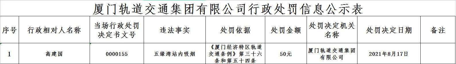厦门轨道交通集团有限公司行政处罚信息公示(2021.8.17-2021.8.23)
