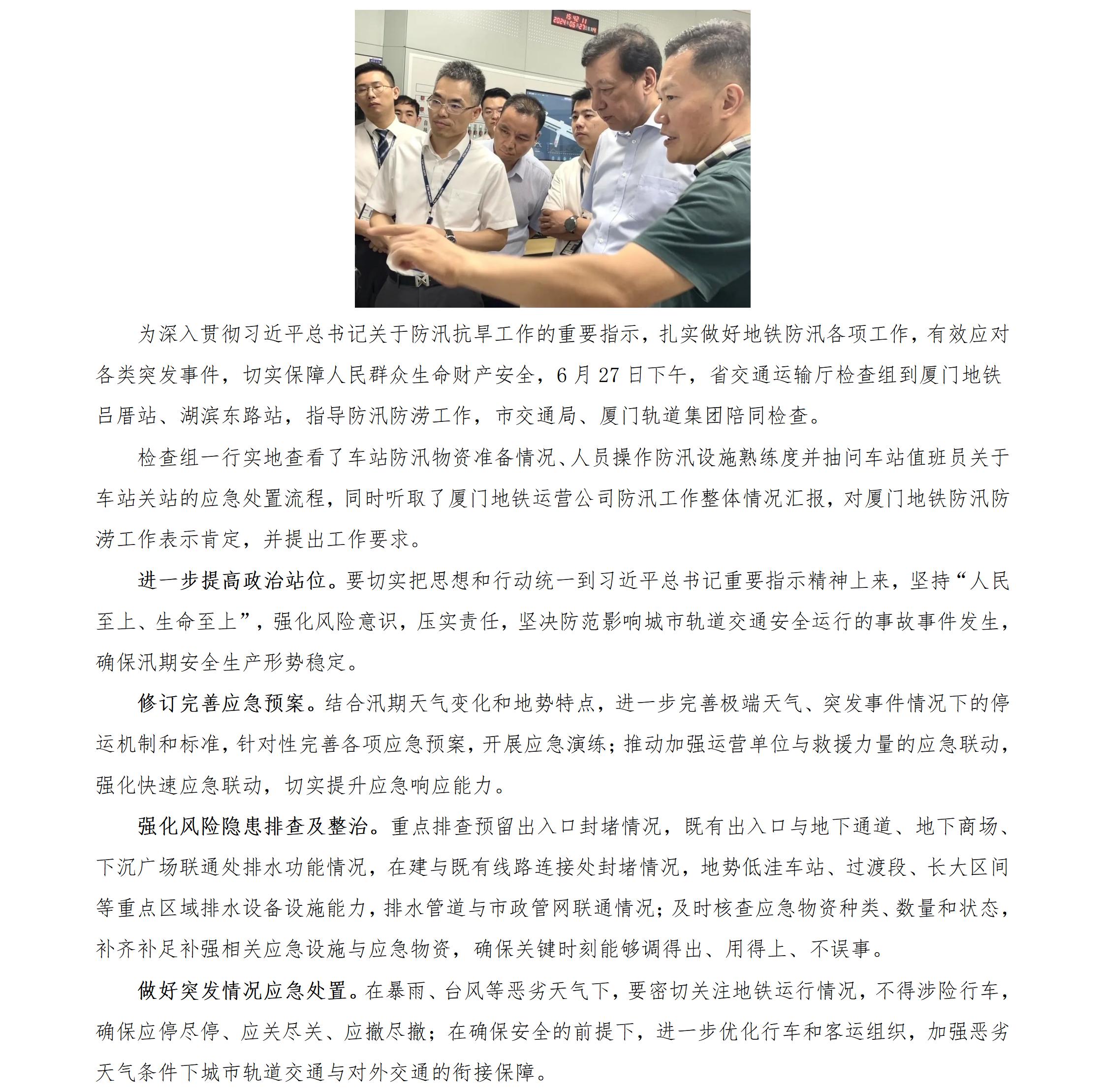 交通运输厅指导厦门地铁防汛防涝工作