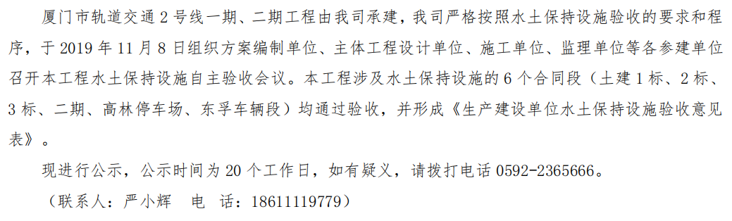 关于厦门市轨道交通2号线一期、二期工程水土保持设施验收的公示