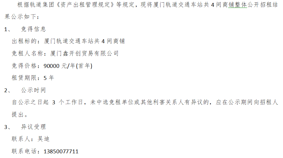 厦门轨道交通车站4间商铺整体公开招租结果公示