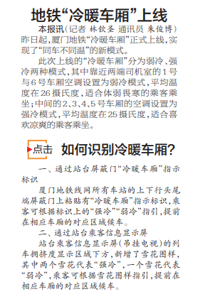 本报讯(记者 林钦圣 通讯员 朱俊博)昨日起,厦门地铁“冷暖车厢”正式上线,实现了“同车不同温”的新模式。