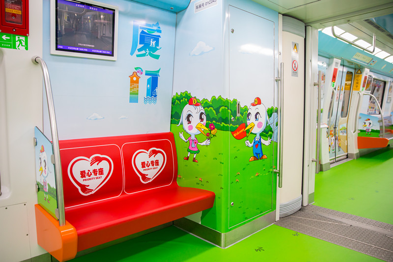 走进“文明小白鹭”地铁主题车厢,映入眼帘的是一片盎然的绿色,车厢地面被布置成“草地”,车厢顶部汇集了日光岩、白鹭女神等厦门元素。车厢既然是“文明小白鹭”主题,定然少不了主人公“文文”和“明明”的身影。